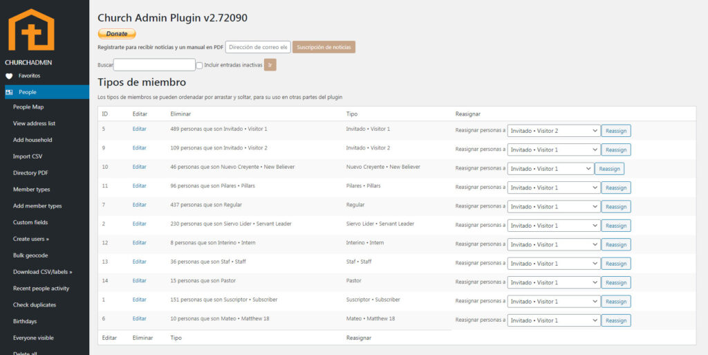 Hay dos tipos de miembro por defecto: Suscriptor y Miembro. Si importaste tu directorio como CSV, todos fueron asignados como el tipo de miembro Suscriptor. Te puede resultar útil añadir más, por ejemplo, Visitante, Asistente regular, Personal, etc.