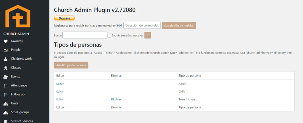 Puedes encontrar Tipos de personas bajo Ajustes en el menú de Church Admin.