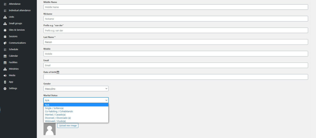 To change someone’s marital status, go to People in the Church Admin menu. At the top of the page, use the search field to find the person you would like to edit.