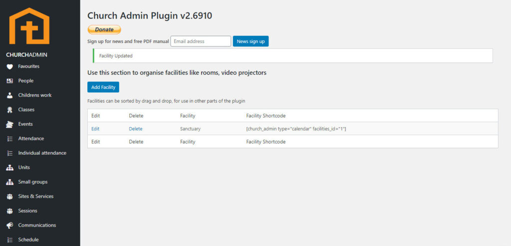 The Facilites feature is a very simple tool to use. Entering your facilities into Church Admin allows you to keep track of what is being used when. You can completely eliminate the problem of multiple events planned for the same place at the same time, and the problem of multiple people planning on using the same resources at the same time. Now, when an event is being planned, it is easy to check the facilities calendar to see if the room or venue you want to use is free for the day you need it.