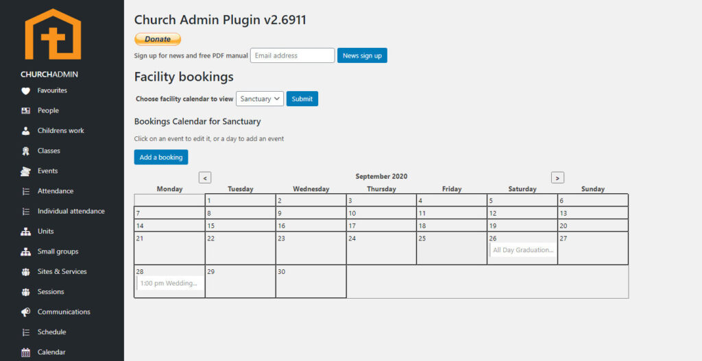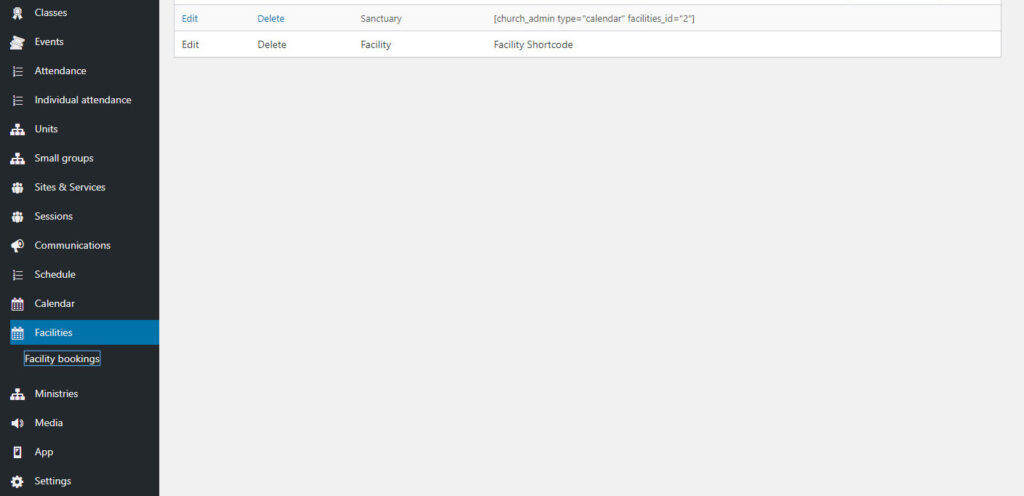 You can now go to Facility Bookings under Facilities in the Church Admin menu to add calendar items with assigned facilities, or you can go to Calendar right above Facilities in the menu and add a Calendar event from there.