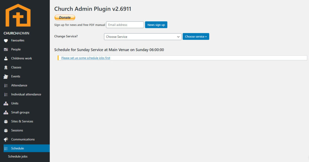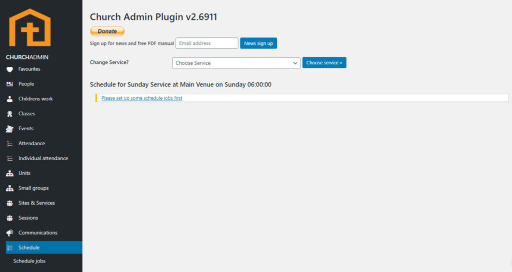 To set up the schedule, go to Schedule in the Church Admin menu.