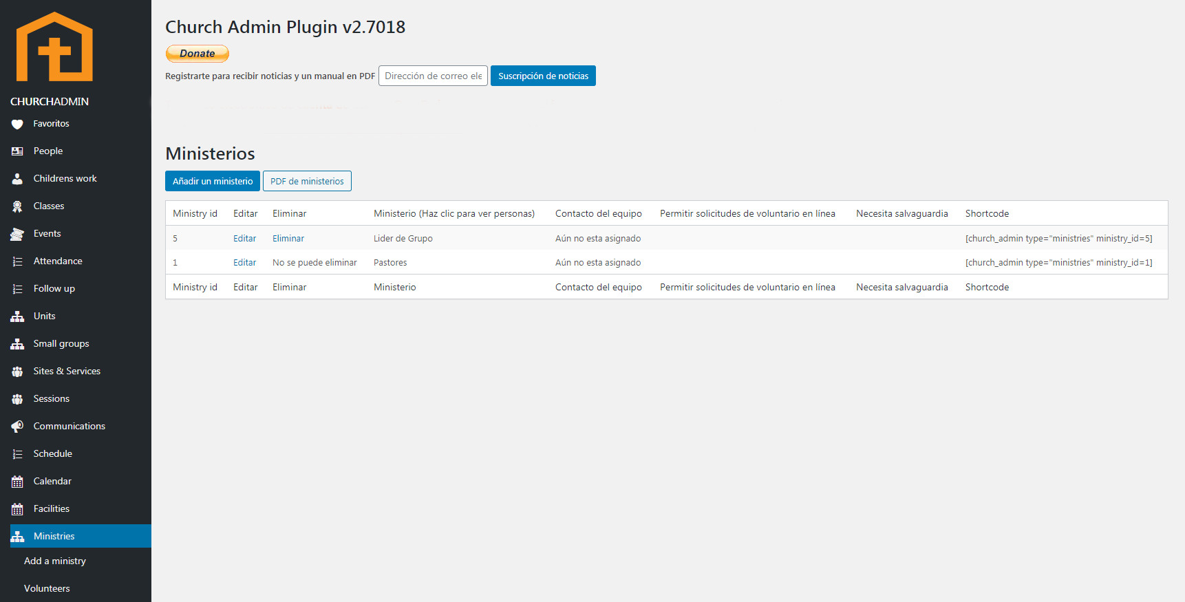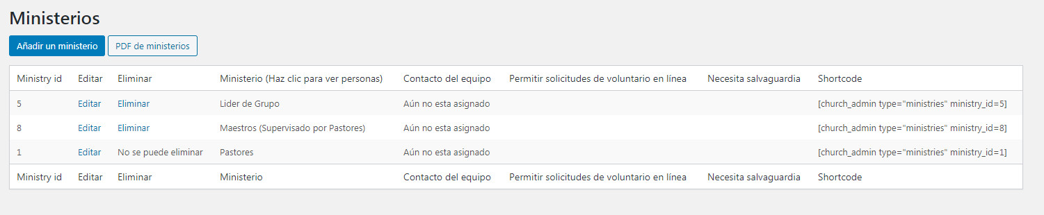 Para ayudarte a empezar, el plugin tiene “Anciano” y “Líder de grupo pequeño” por defecto. Puedes eliminar “Anciano” si deseas y añadir cualquier ministerio que tu iglesia tiene. Sin embargo “Líder de grupo pequeño” no se puede eliminar porque es una parte vital de la sección de Grupos pequeños.