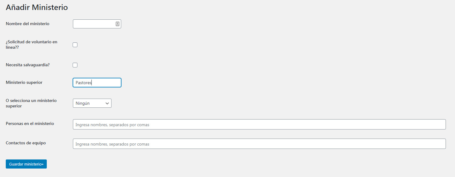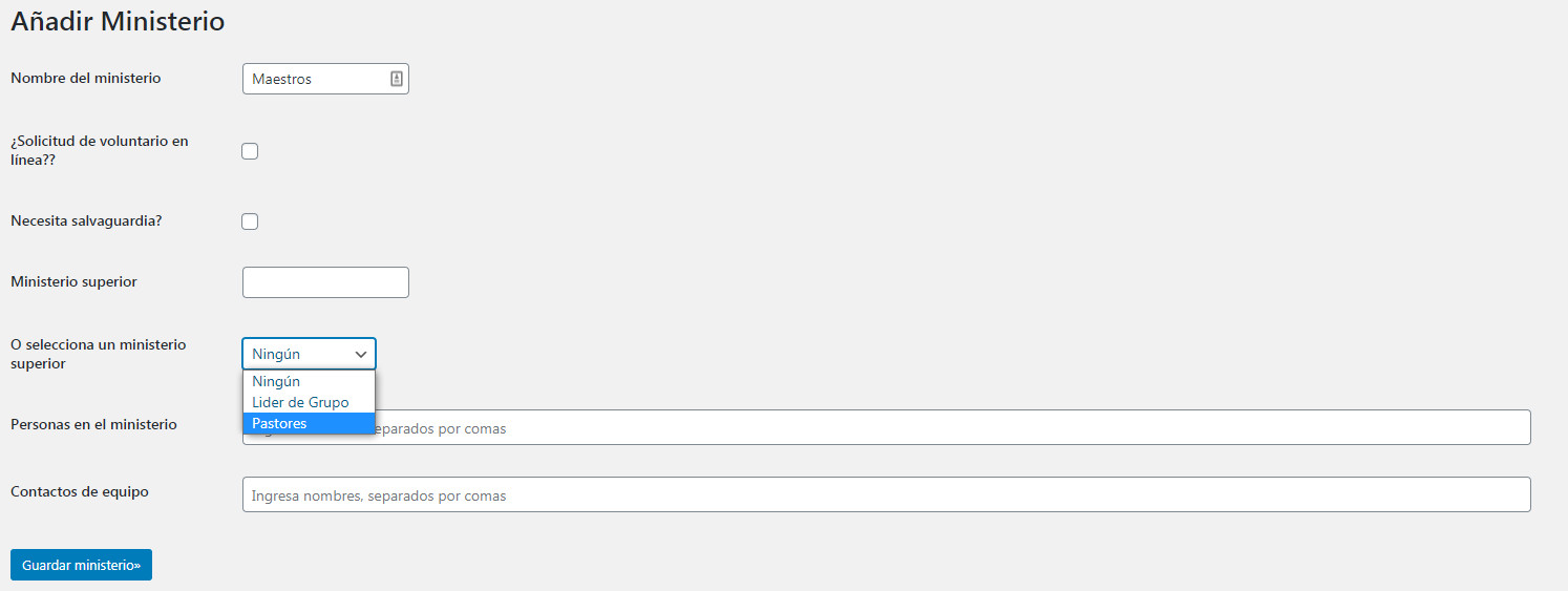 Un Ministerio superior es un ministerio que supervisa otro ministerio. Por ejemplo Pastores sería el ministerio superior de Personal. Si deseas añadir un ministerio superior al ministerio que estás creando, hay dos opciones: